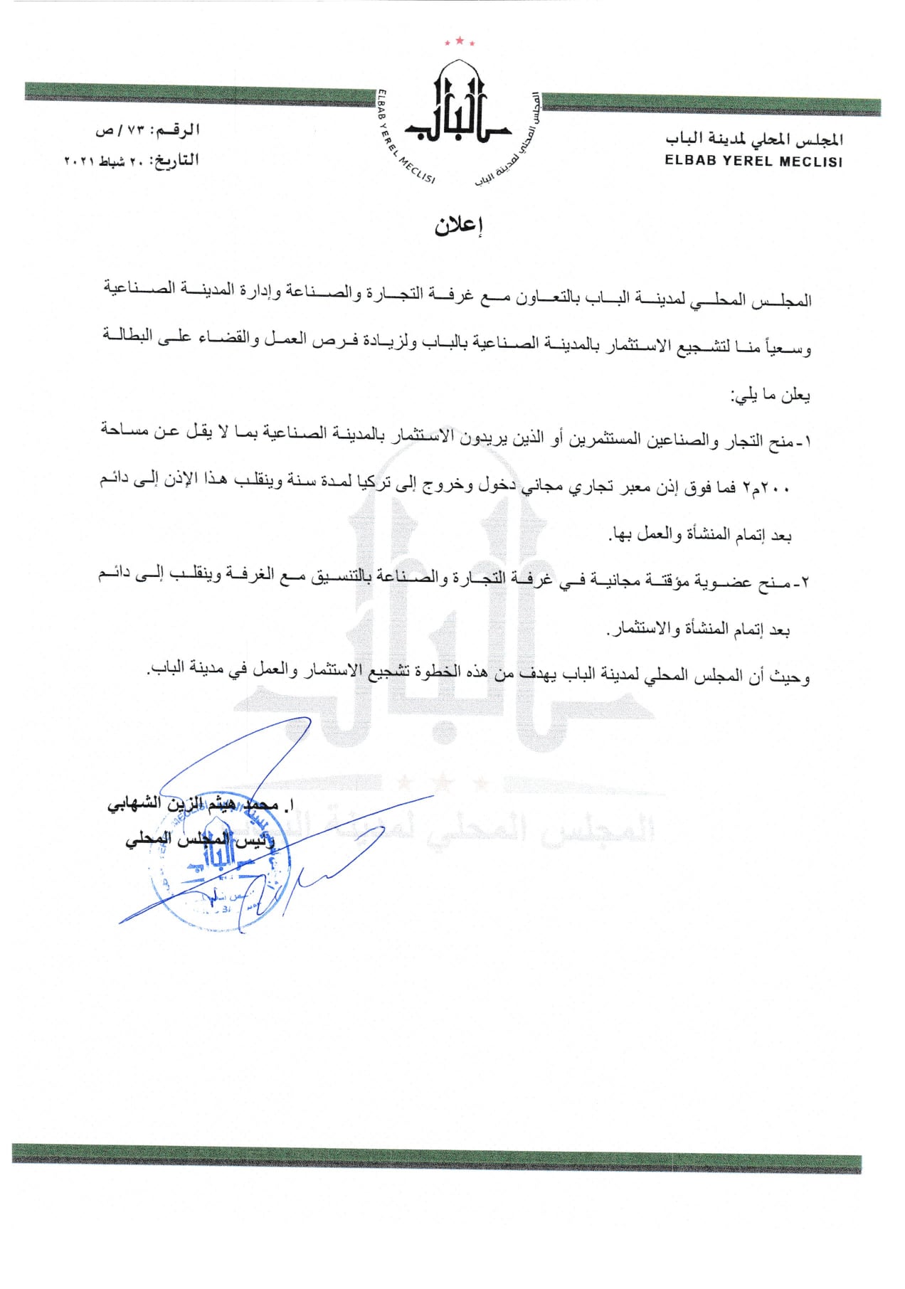 بيان من المجلس المحلي لمدينة الباب بالتعاون مع غرفة التجارة والصناعة حول منح إذن معبر للتجار
