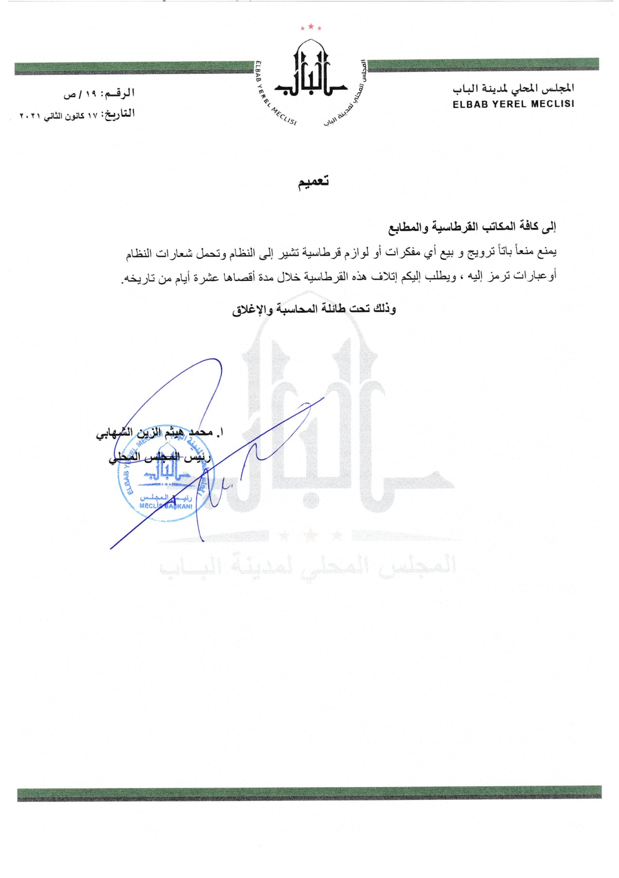 تعميم من المجلس المحلي لمدينة الباب إلى المكاتب القرطاسية والمطابع بمنع بيع أدوات تشير إلى النظام