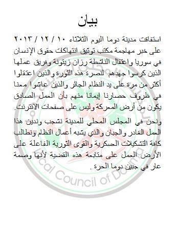 بيان من المجلس المحلي في مدينة دوما يدين فيه اختطاف الناشطة رزان زيتونة ورفاقها