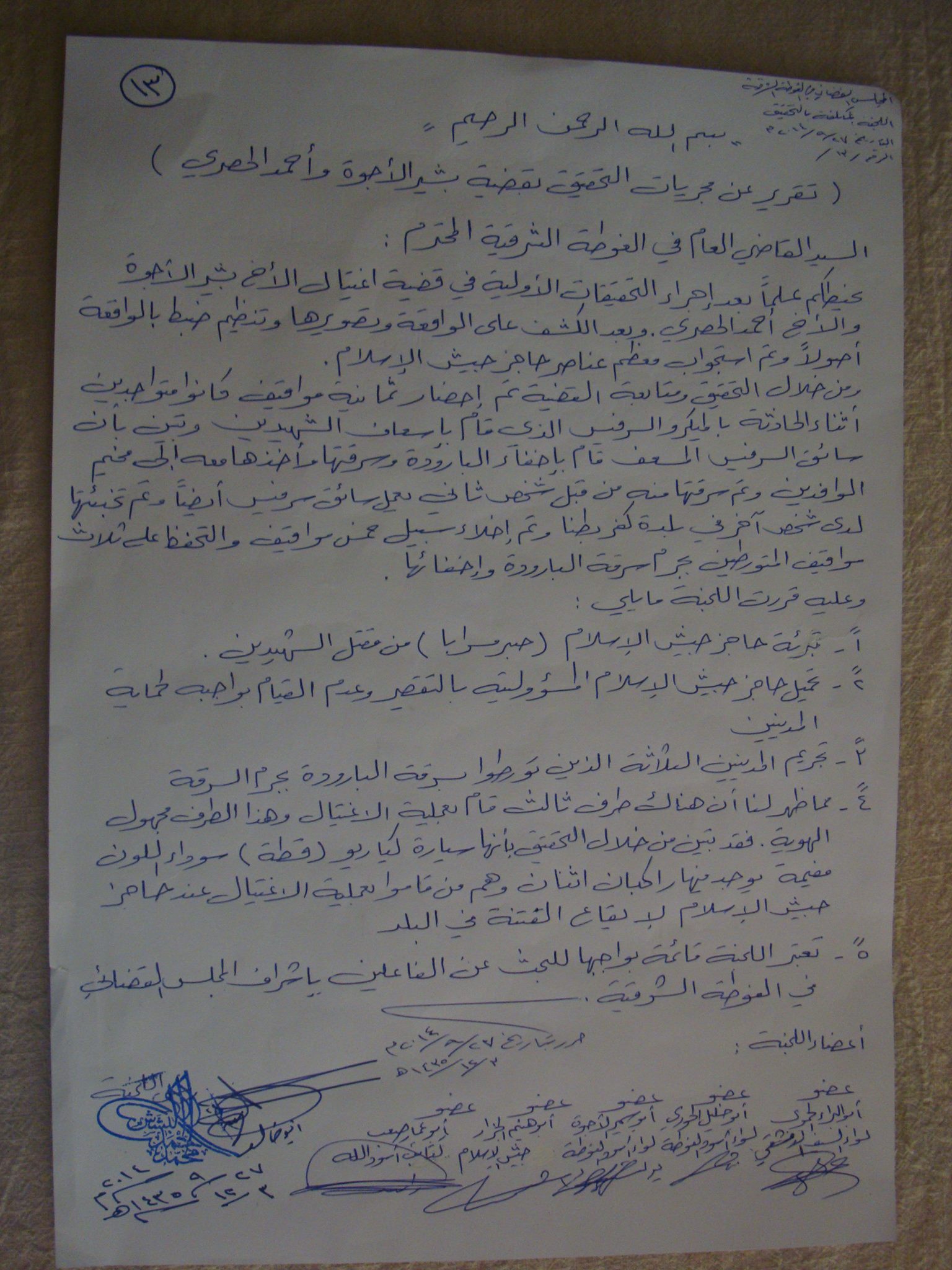 نحيطكم علماً بعد إجراء التحقيقات الأولية في قضية اغتيال الأخ بشير الأجوة والأخ أحمد الحصري وبعد الكشف على الواقعة وتصويرها وتنظيم ضبط بالواقعة أصولاً وتم استجواب معظم عناصر حاجز جيش الإسلام.