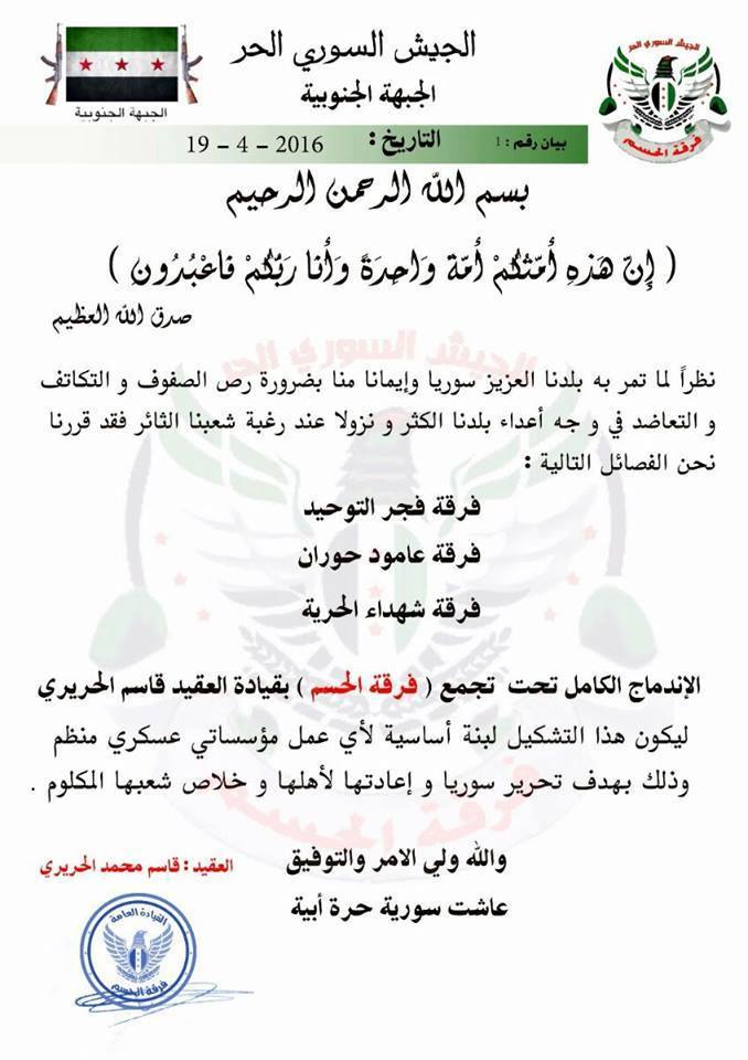 بيان من عدة فصائل عسكرية في درعا تعلن فيه عن تشكيل فرقة الحسم