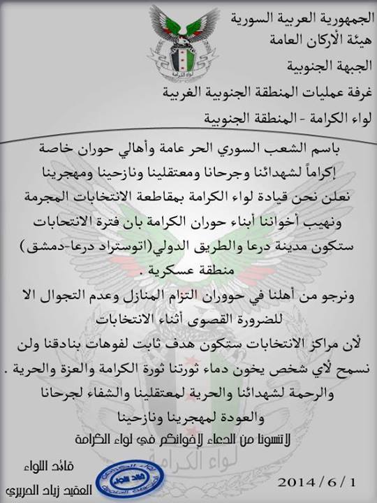 بيان من قيادة لواء الكرامة بمقاطعة الانتخابات بأن فترة الانتخابات ستكون مدينة درعا و الطريق الدولي ( اوتستراد درعا - دمشق ) منطقة عسكرية
