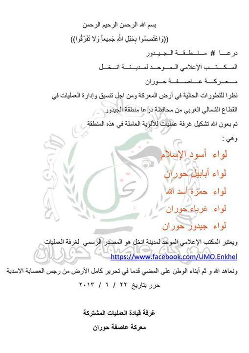 بيان تشكيل غرفة عمليات مشتركة لمعركة عاصفة حوران