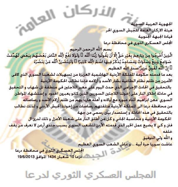 بيان من المجلس العسكري الثوري في محافظة درعا لمطالبة الحكومة الأردنية بالتحقيق بإطلاق النار على اللاجئين السوريين ومقتل أحدهم