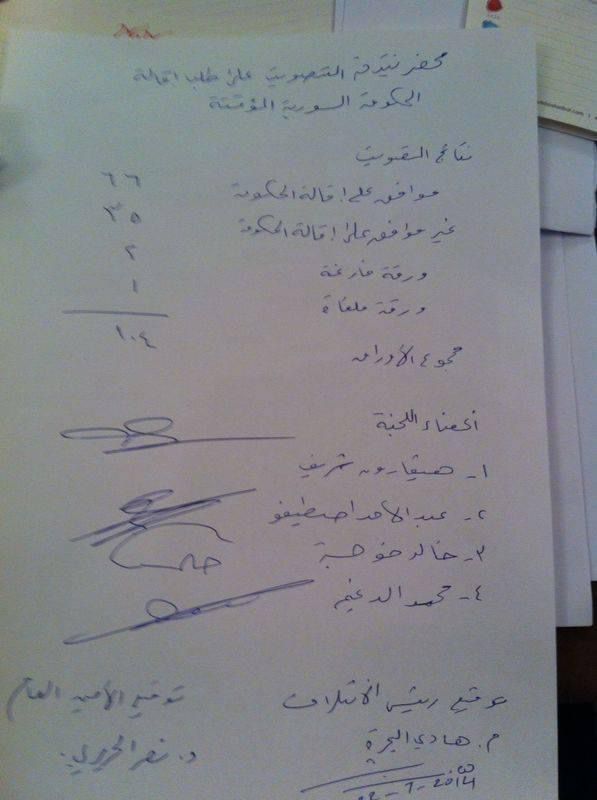 نتائج التصويت على إقالة الحكومة السورية المؤقتة برئاسة أحمد طعمة من قبل أعضاء الائتلاف الوطني
