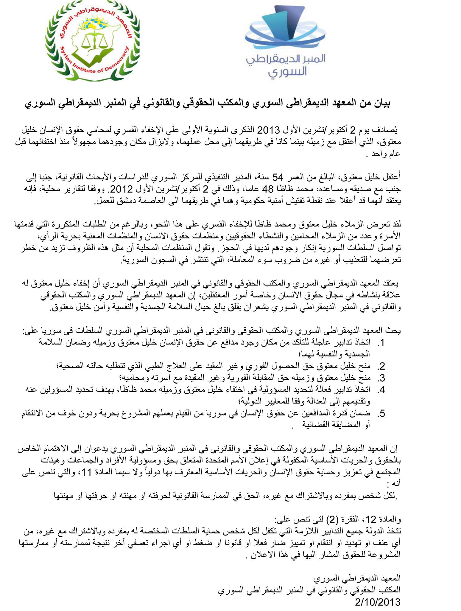 بيان من المعهد الديمقراطي السوري والمكتب الحقوقي والقانوني في المنبر الديمقراطي السوري حول لذكرى السنوية الأولى على الإخفاء القسري لمحامي حقوق الإنسان خليل معتوق
