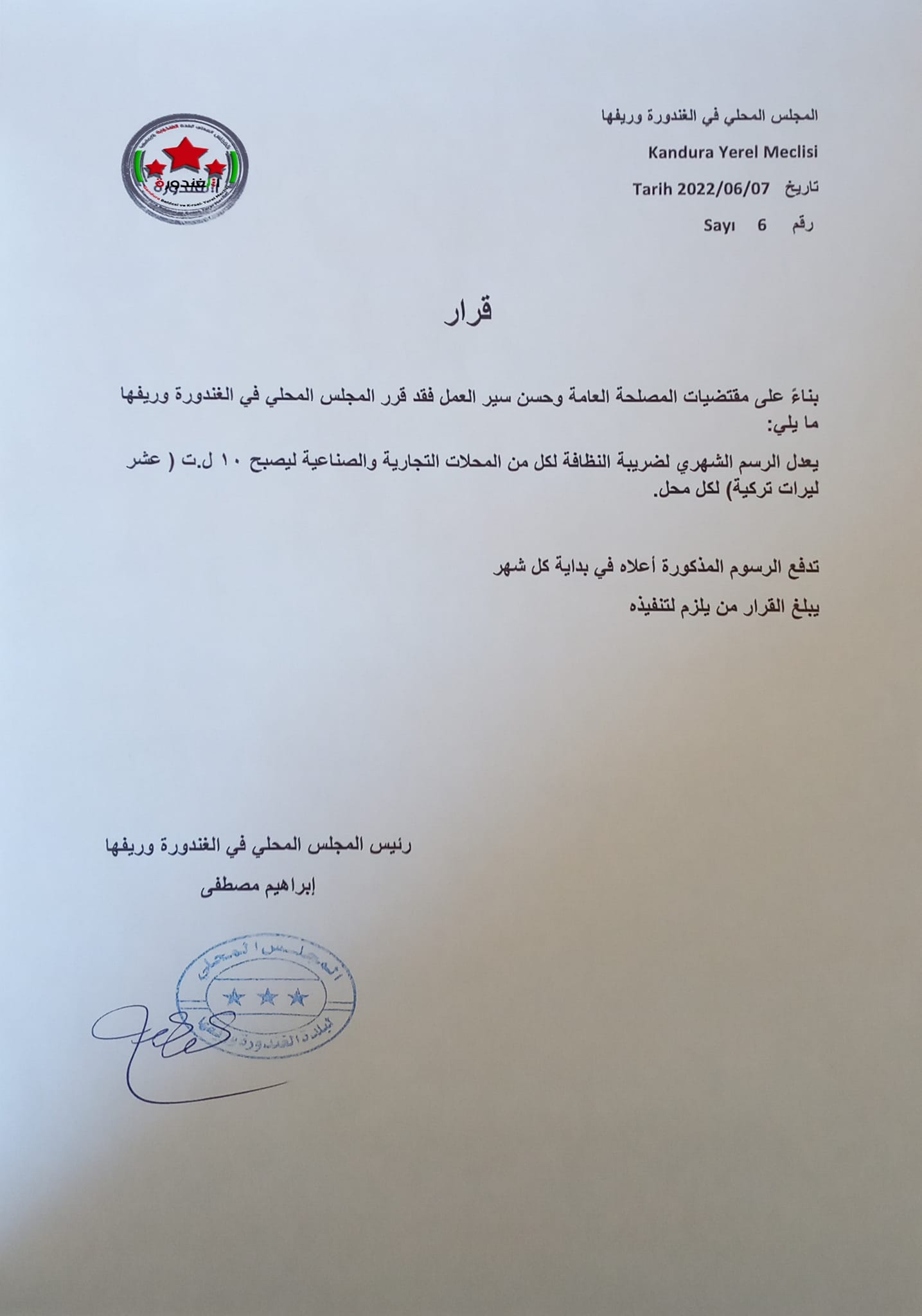 قرار من المجلس المحلي لبلدة الغندورة وريفها بشأن تحديد الرسم الشهري لضريبة النظافة للمحال التجارية