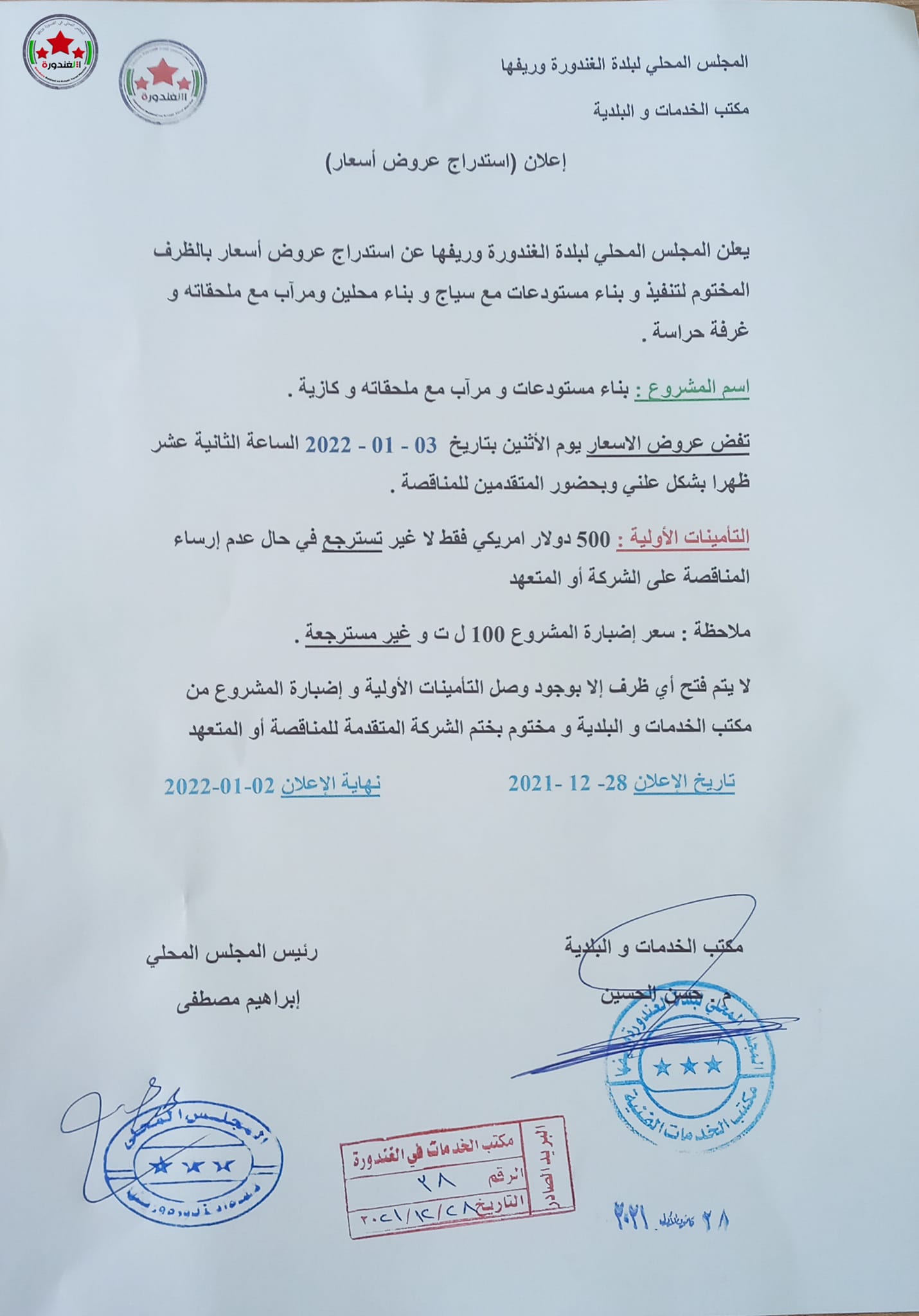 بيان من المجلس المحلي لبلدة الغندورة وريفها يعلن فيه عن رغبته باستدراج عروض أسعار لتنفيذ بناء مع مستودع ومرآب