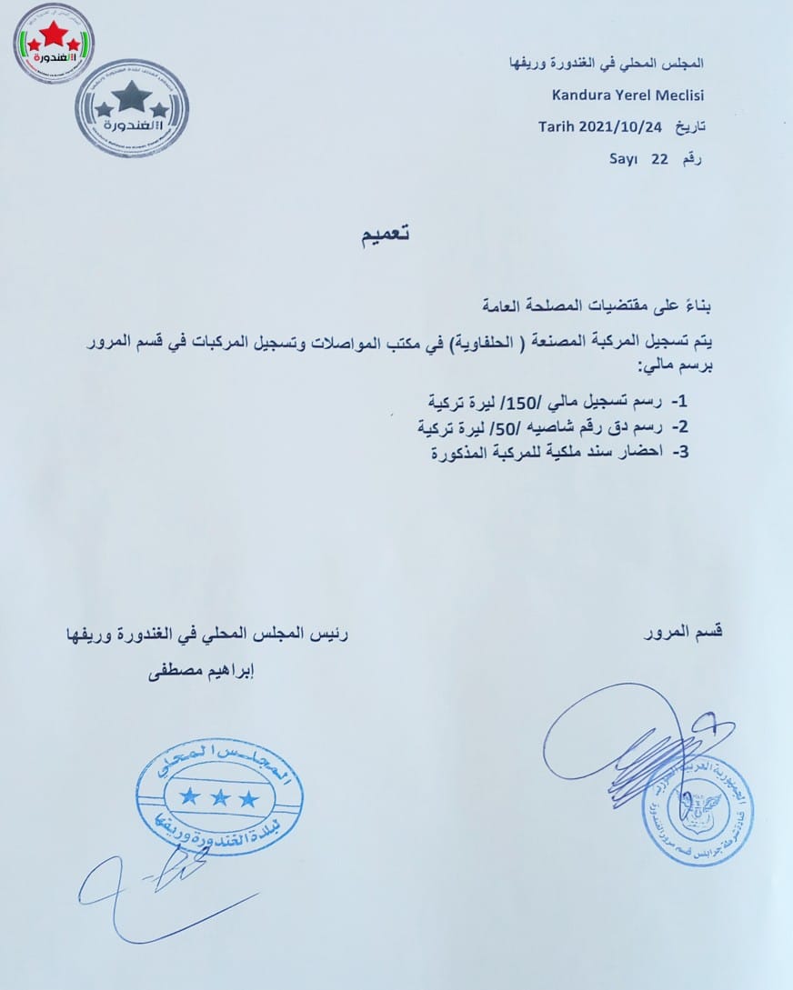 تعميم صادر من مكتب المرور لبلدة الغندورة وريفها بخصوص تسجيل المركبة المصنعة (الحلفاوية)
