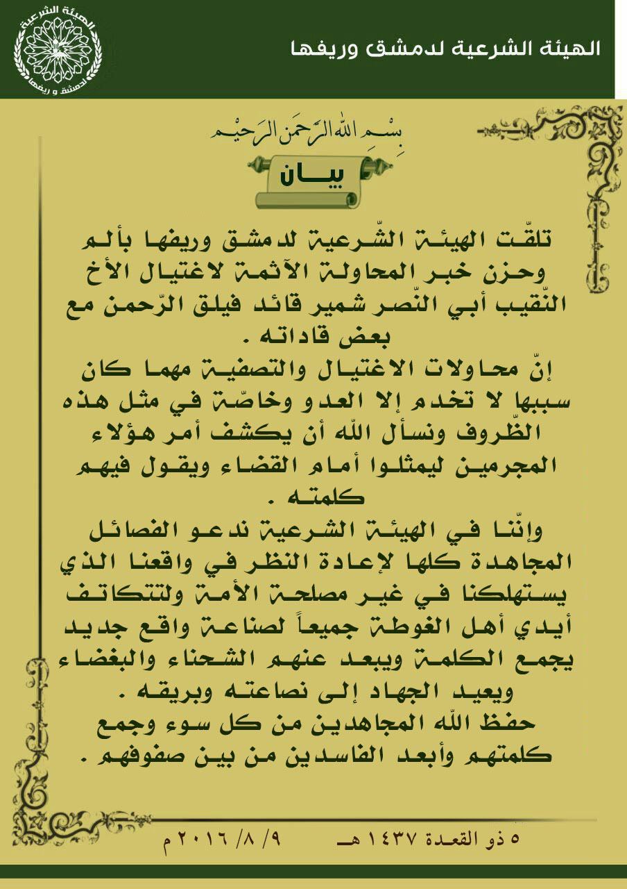 بيان إدانة من الهيئة الشرعية في دمشق وريفها لمحاولة اغتيال أبو النصر شمير قائد فيلق الرحمن