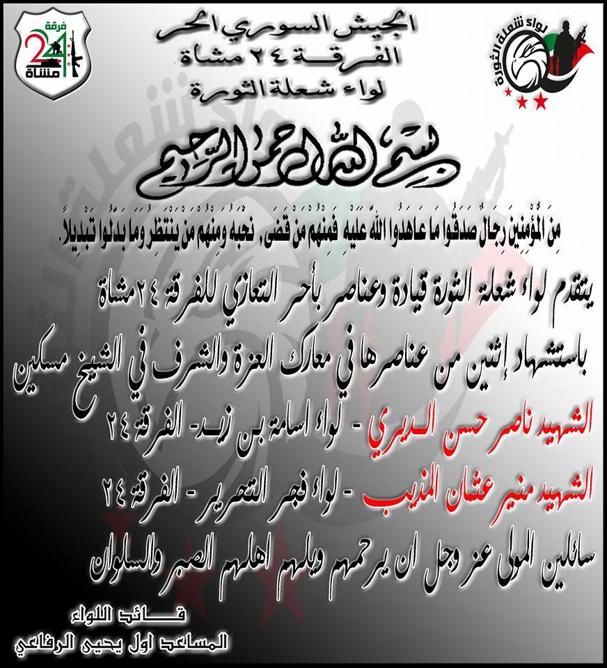 بيان من لواء شعلة الثورة تعزي فيه الفرقة 24 مشاة باثنين من عناصرها في معارك الشيخ مسكين