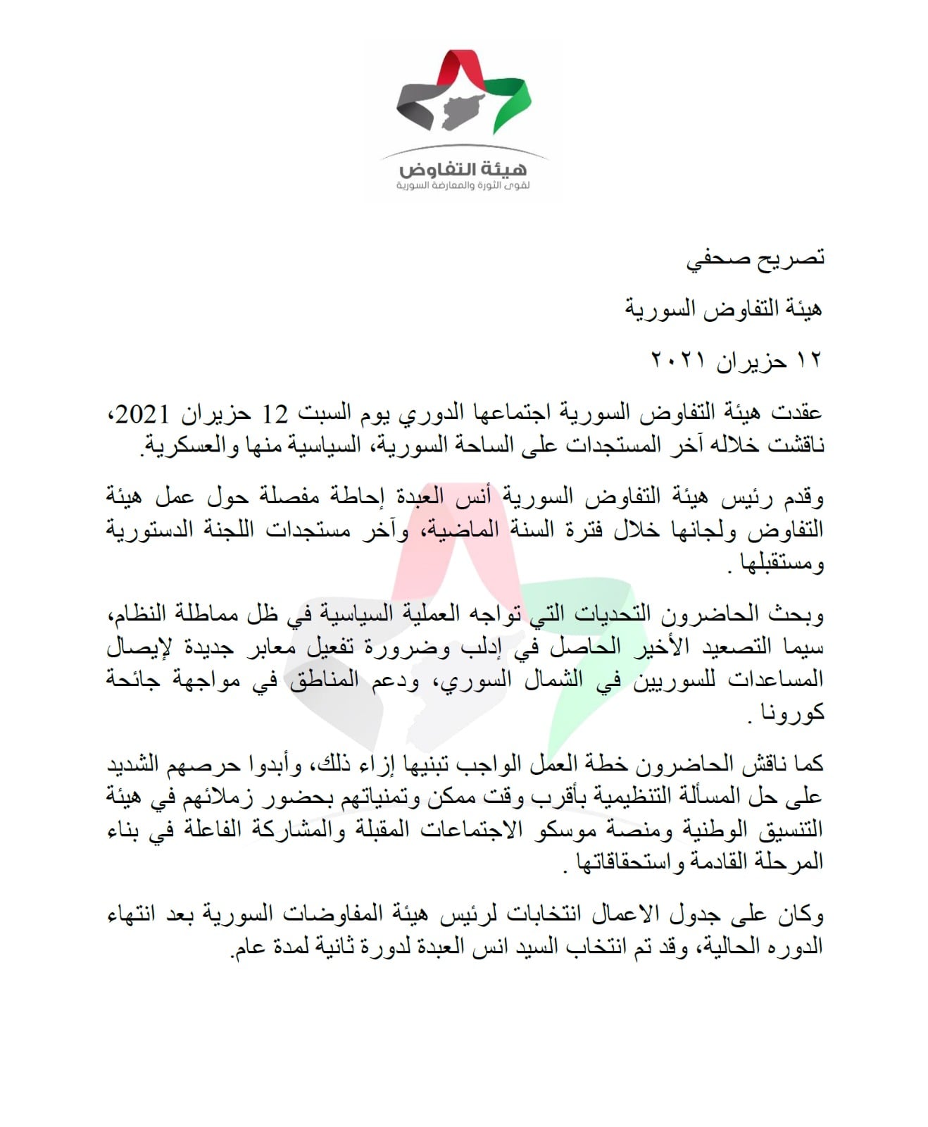 عقدت هيئة التفاوض السورية اجتماعها الدوري يوم السبت 12 حزيران 2021، ناقشت خلاله آخر المستجدات على الساحة السورية، السياسية منها والعسكرية.