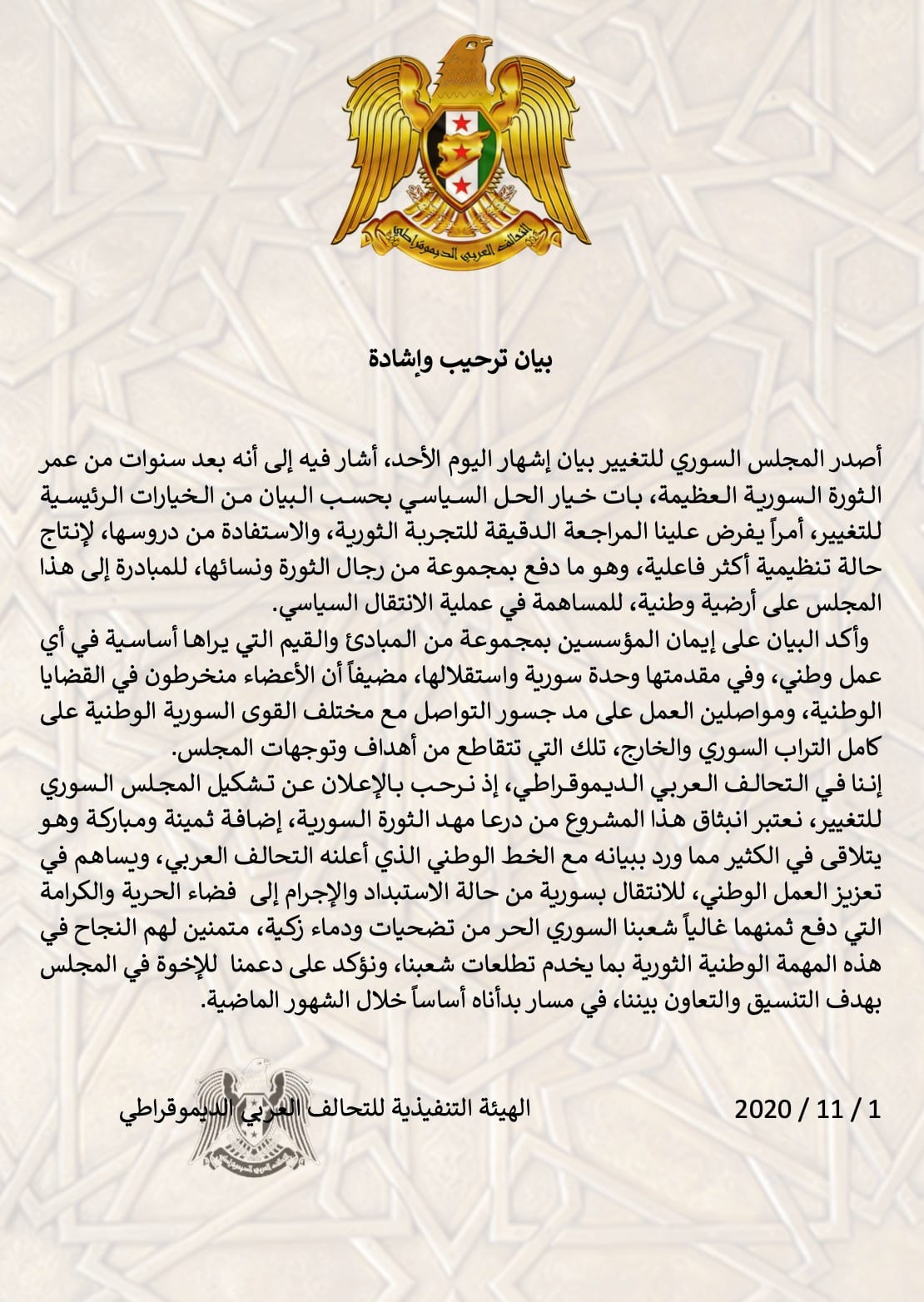 بيان ترحيب التحالف العربي الديموقراطي بإشهار المجلس السوري للتغيير