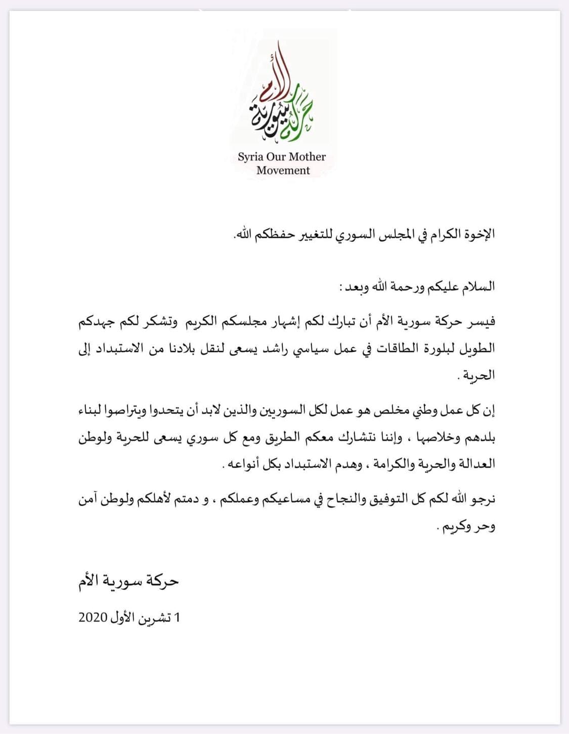 بيان ترحيب حركة سورية الأم بإشهار المجلس السوري للتغيير