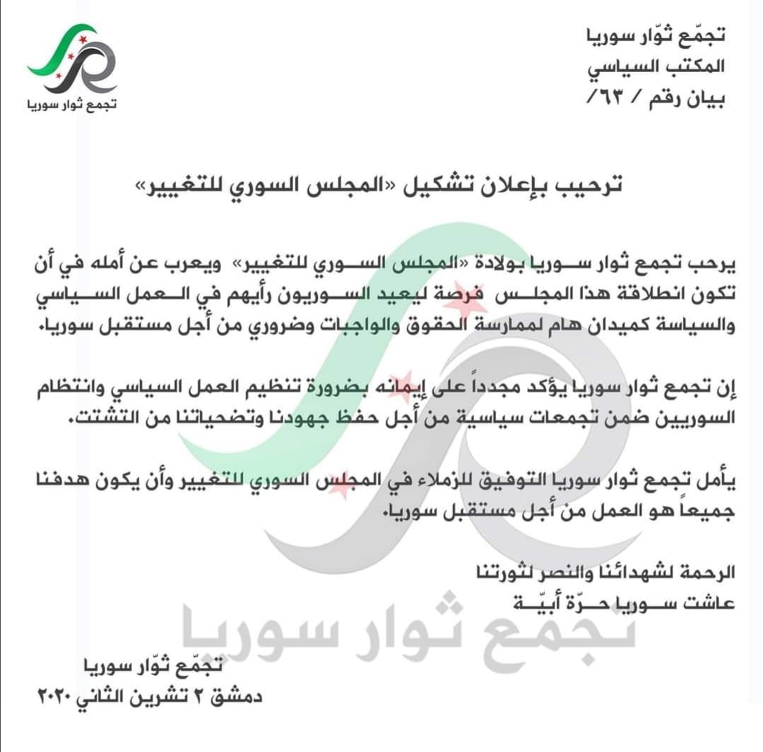 بيان ترحيب حركة ثوار سوريا بإعلان تشكيل المجلس السوري للتغيير