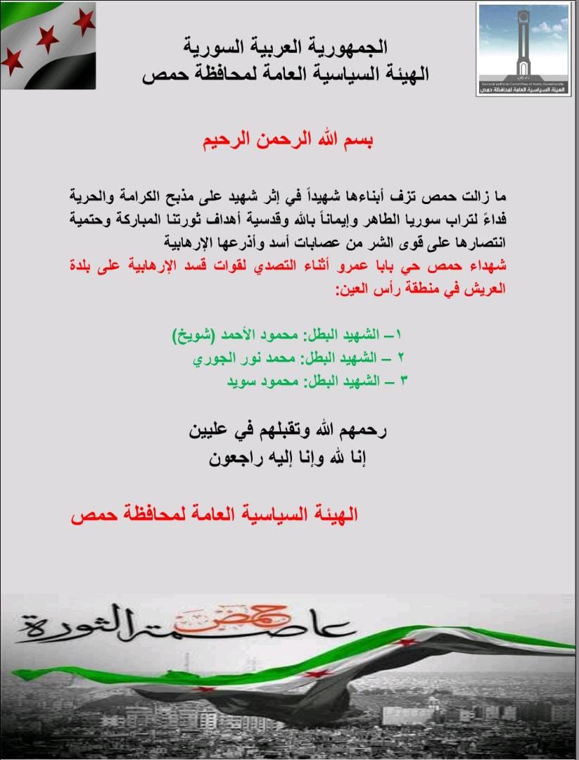 بيان من الهيئة السياسية العامة لمحافظة حمص تنعي فيه عدد من مقاتلي حمص على جبهة رأس العين ضد المليشيات الإنفصالية