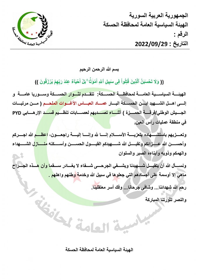 الهيئة السياسية العامة لمحافظة الحسكة: تتقدم لثوار الحسكة وسوريا عامة و إلى اهل الشهيد ابن الحسكة البار عماد العباس الأغوات الملحم ( من مرتبات الجيش الوطني/فرقة الحمزة ) أثناء تصديهم لعصابات تنظيم قسد الإرهابي PYD في منطقة عمليات رأس العين.