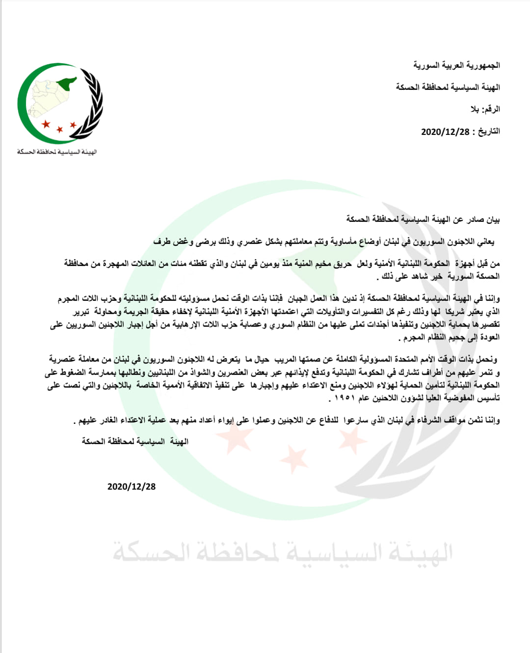 بيان من الهيئة السياسية العامة لمحافظة الحسكة تدين فيه حرق خيام اللاجئين في لبنان