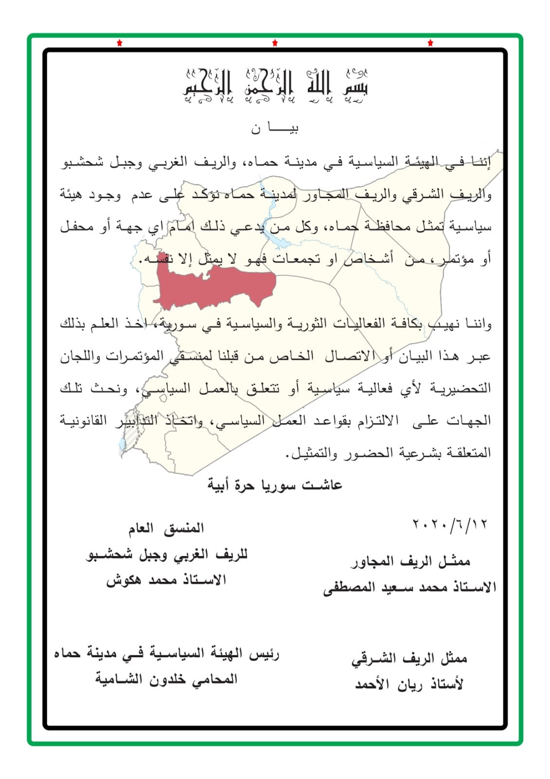 بيان من الهيئة السياسية لمدينة حماة تؤكد فيه عدم وجود هيئة سياسية تمثل محافظة حماة في المحافل الدولية
