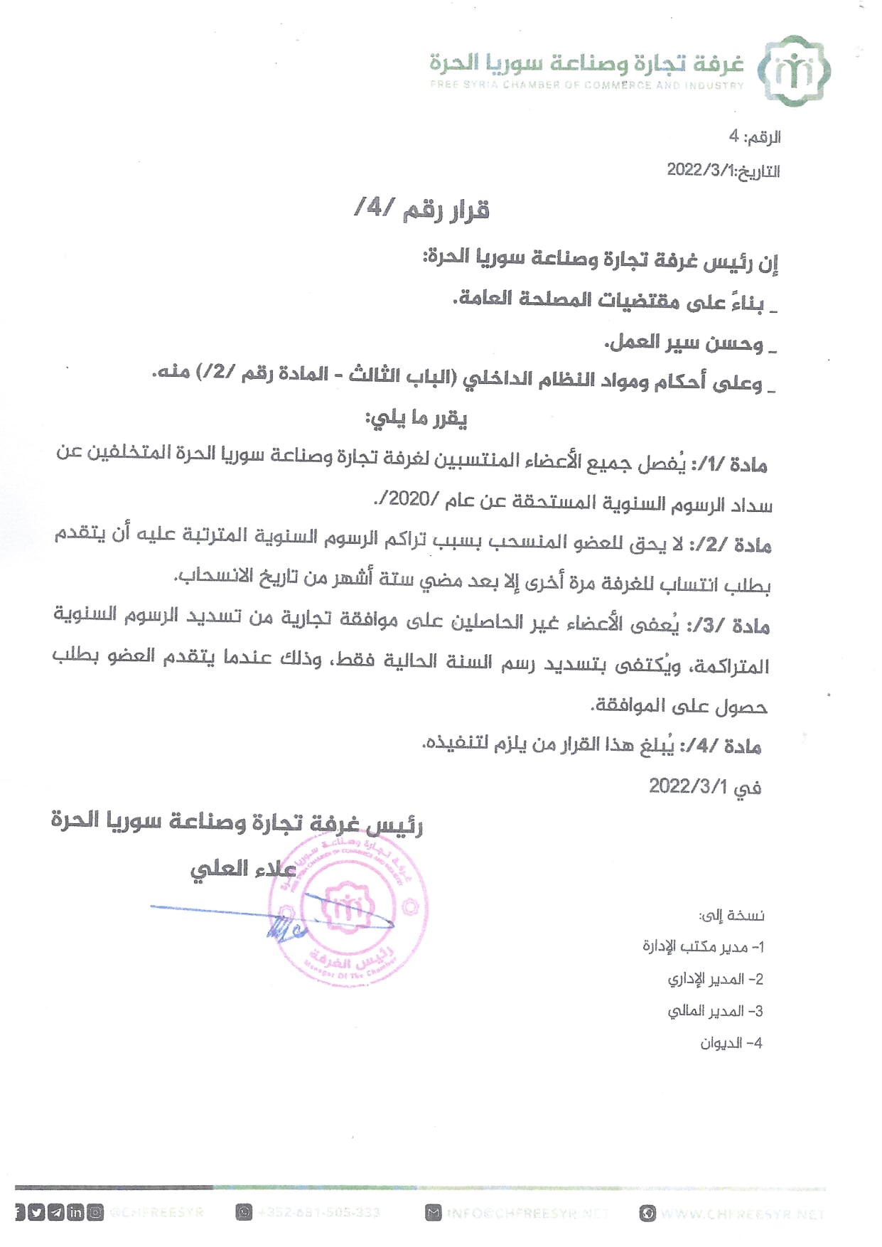 قرار من غرفة تجارة وصناعة سوريا الحرّة بفصل الأعضاء المتخلفين عن سداد الرسوم السنوية