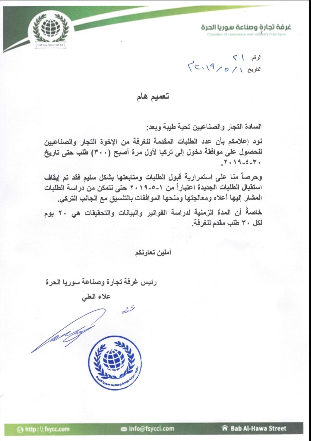 تعميم من غرفة تجارة وصناعة سوريا الحرة بخصوص الموافقات الجديدة