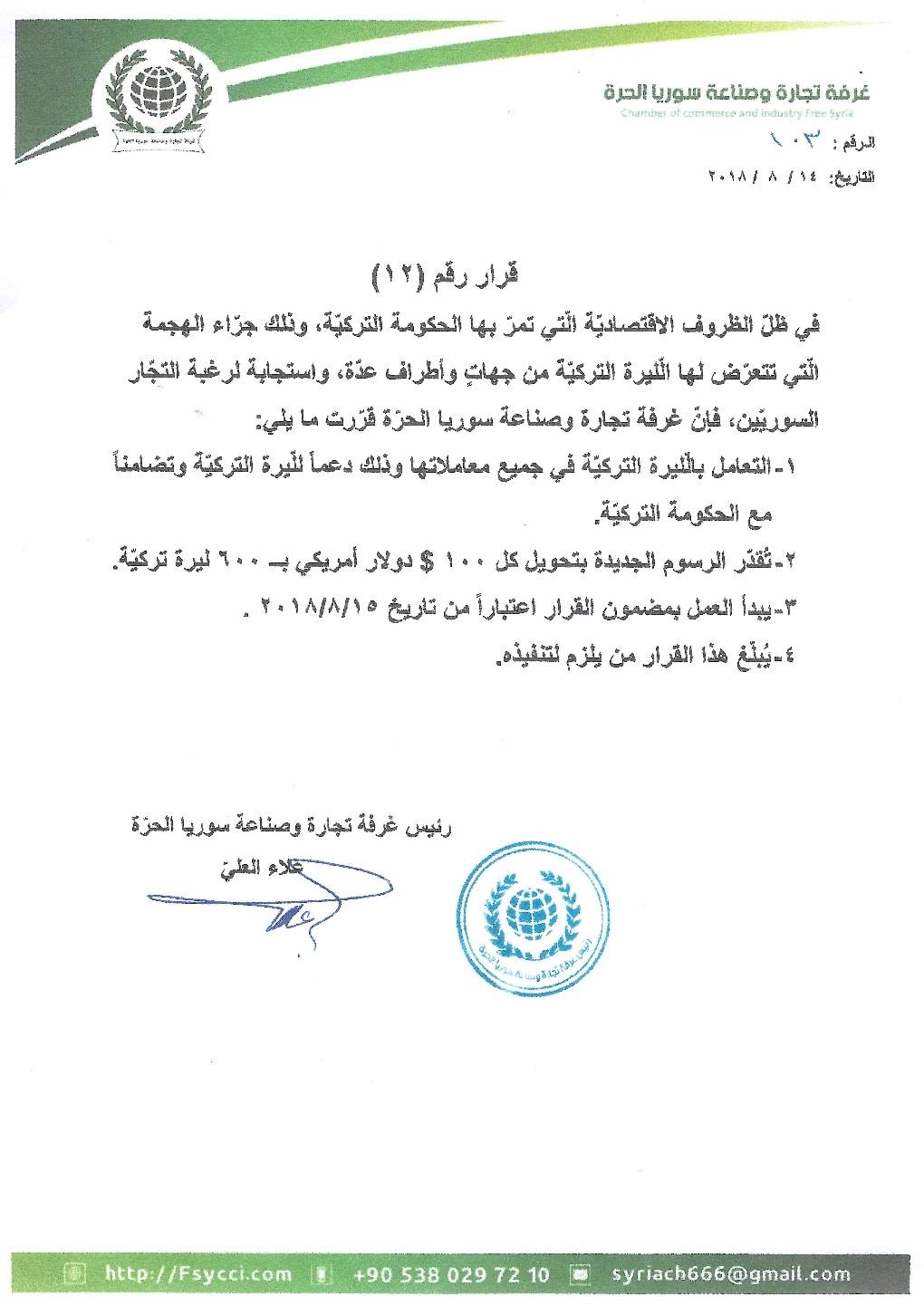تعميم من غرفة تجارة وصناعة سوريا الحرة بخصوص التعامل بالليرة التركية في معاملاتها