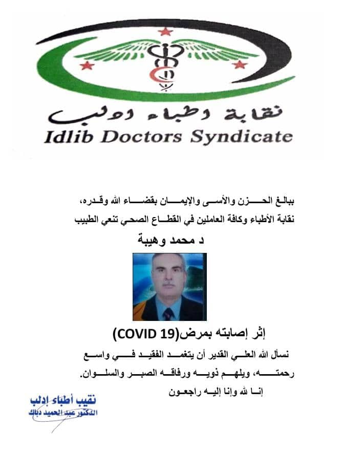 بيان من نقابة اطباء ادلب تعزي فيه بوفاة الطبيب محمد وهيبة