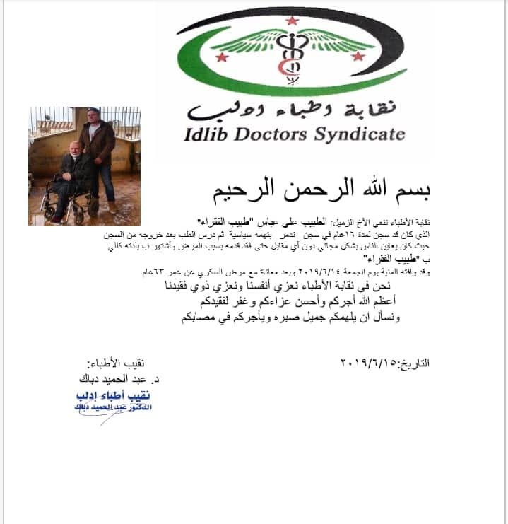 بيان من نقابة أطباء إدلب تعزي فيه بوفاة الطبيب علي عباس "طبيب الفقراء"