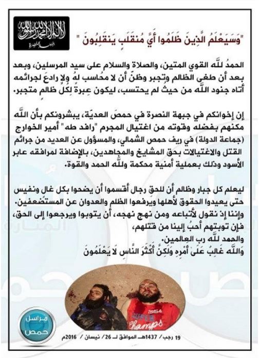 إعلان جبهة النصرة عن قتل رافد طه أمير داعش في ريف حمص الشمالي