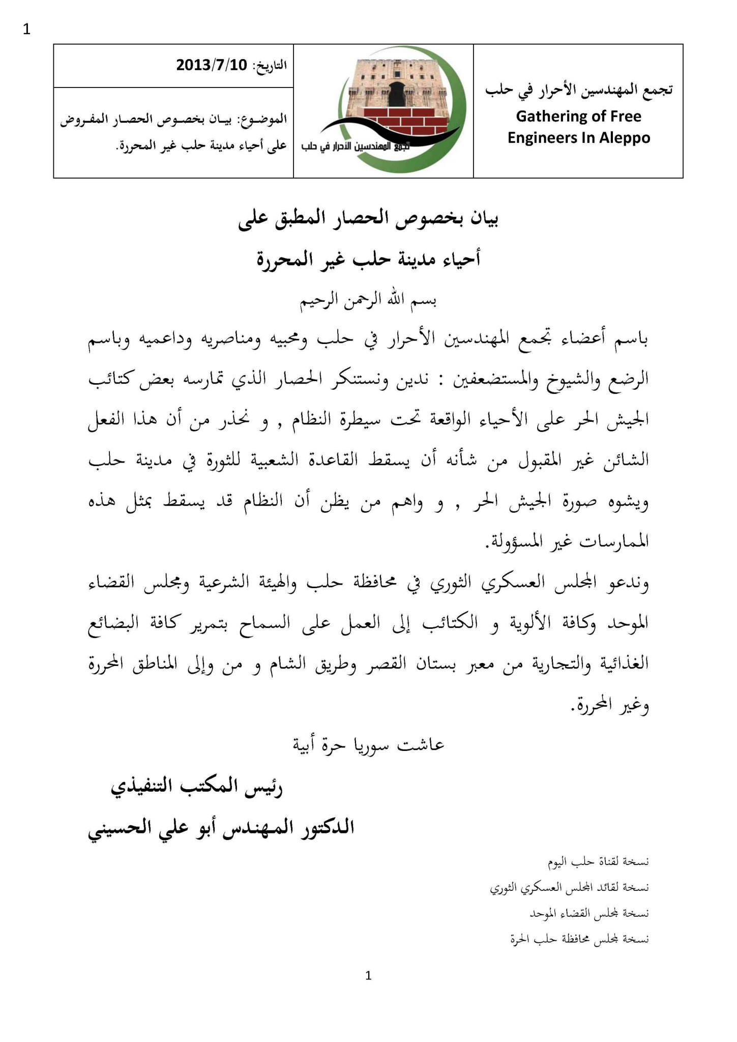 بيان من تجمع المهندسين الأحرار في حلب بخصوص الحصار المفروض على أحياء مدينة حلب الغير محررة