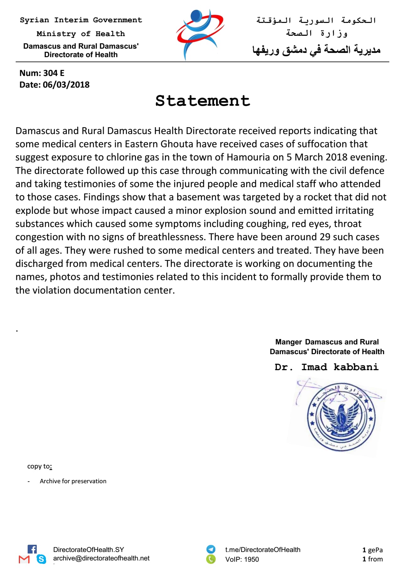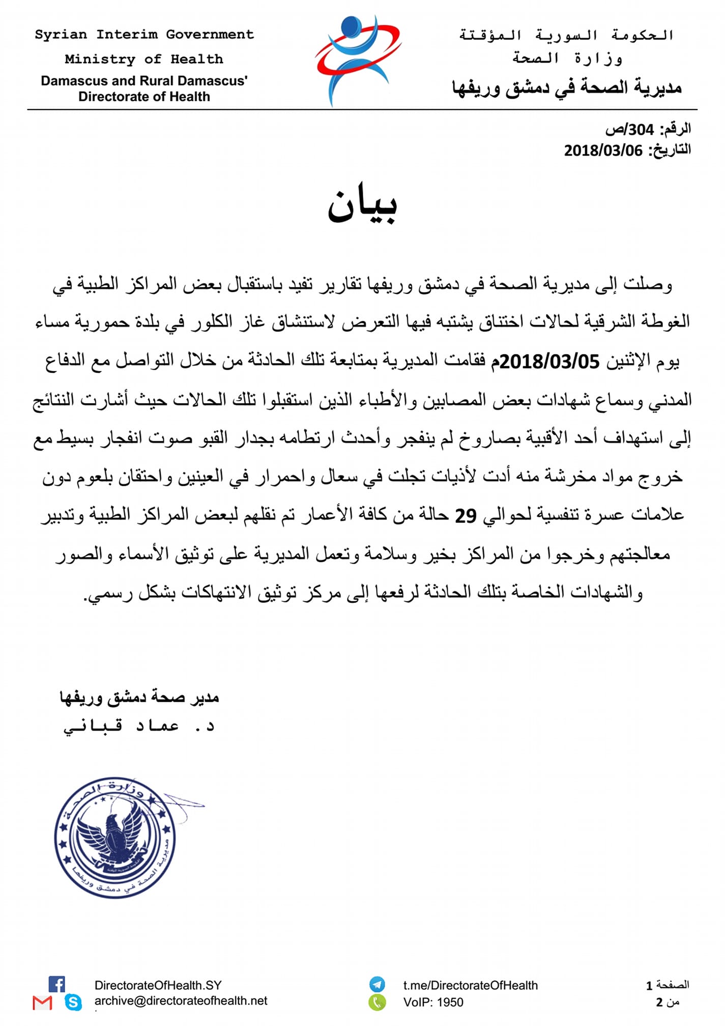بيان من مديرية الصحة في دمشق وريفها حول استهداف بلدة حمورية بالغازات السامة