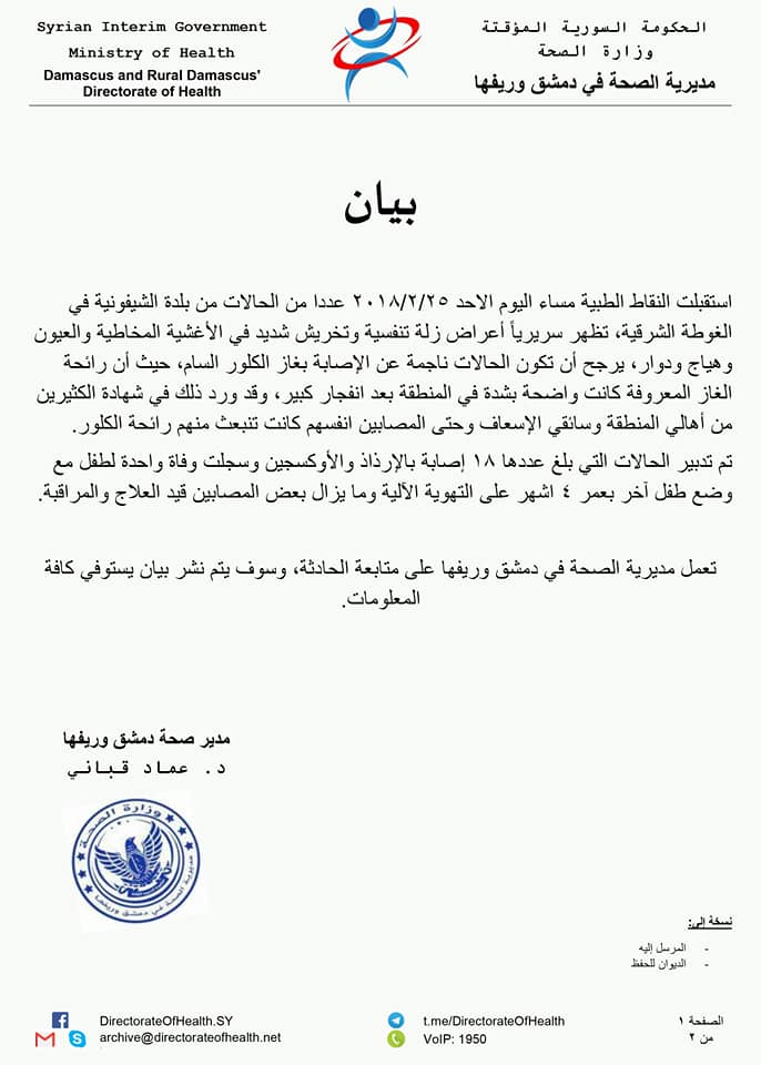 بيان من مديرية الصحة في دمشق وريفها حول استهداف بلدة الشيفونية بالغازات السامة