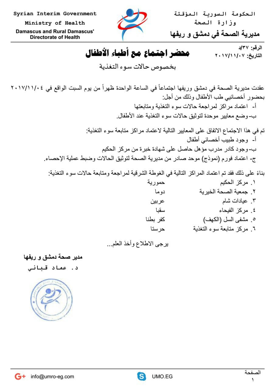 محضر اجتماع مديرية الصحة في دمشق وريفها حول محضر الإجتماع مع أطباء الأطفال بخصوص حالات سوء التغذية