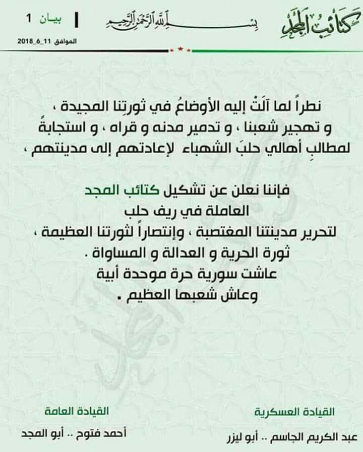 بيان تشكيل كتائب المجد العاملة في ريف حلب