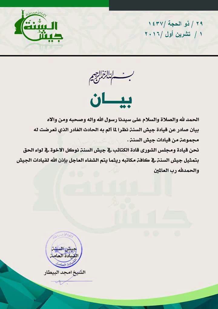 جيش السنة يفوض لواء الحق بتمثيل الفصيل ريثما يتم التعامل مع الخلافات الداخلية