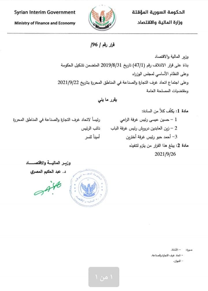 قرار من وزارة المالية والاقتصاد في الحكومة المؤقتة بتعين رئيس لاتحاد غرف التجارة والصناعة في المناطق المحررة