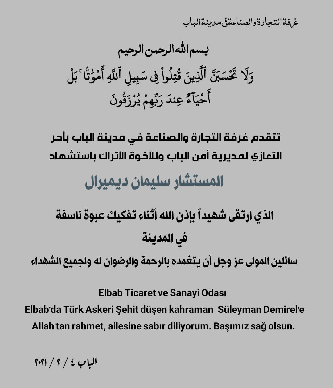 بيان من غرفة التجارة والصناعة في مدينة الباب تعزي فيه تركيا بالمستشار سليمان ديميرال أثناء تفكيكه عبوة ناسفة في المدينة