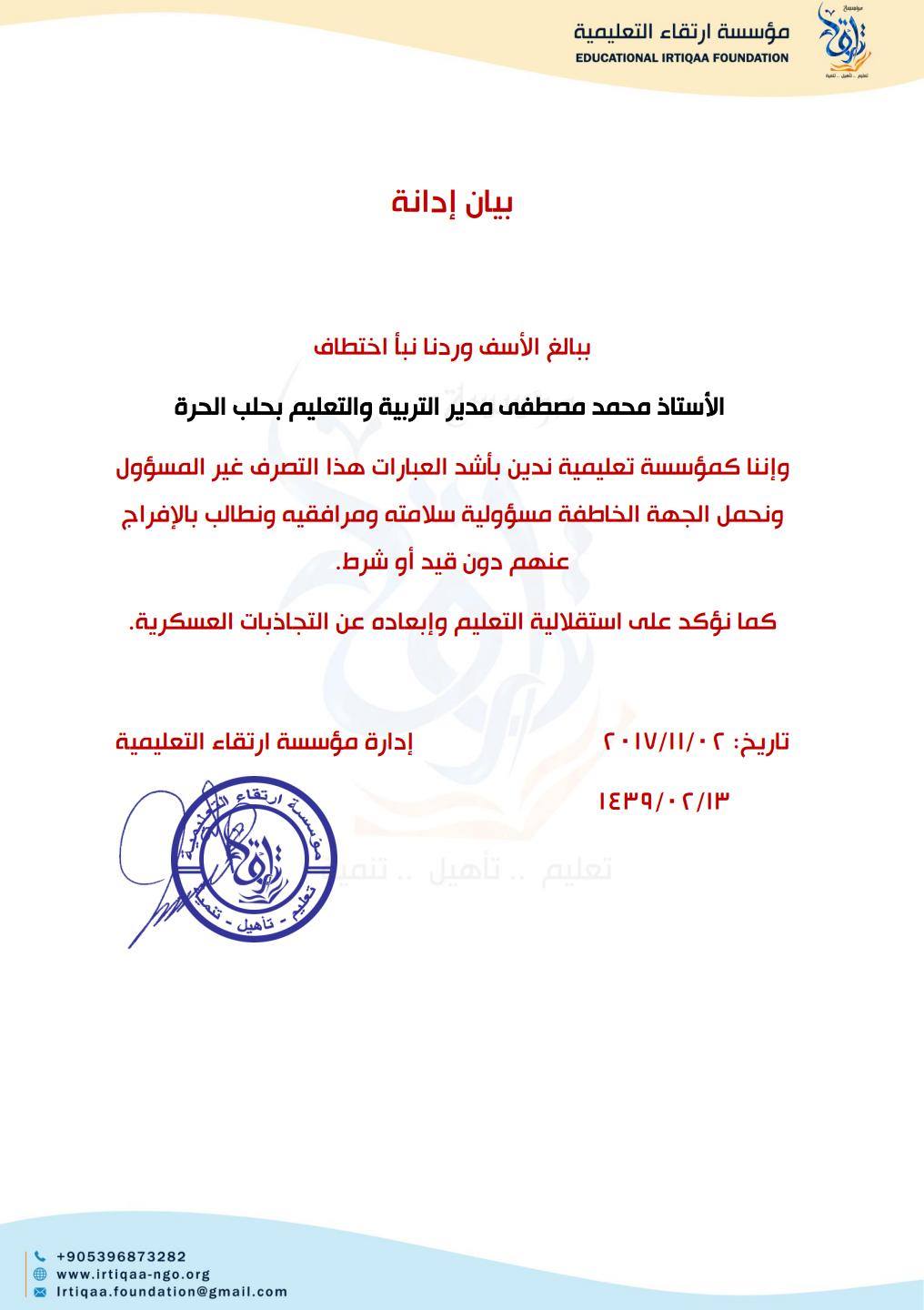بيان من مؤسسة ارتقاء التعليمية تدين فيه اختطاف لأستاذ محمد مصطفى مدير التربية والتعليم بحلب الحرة