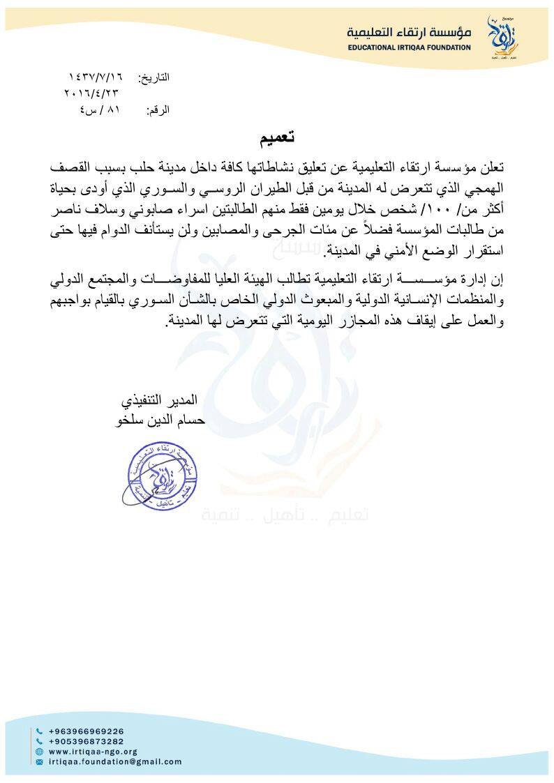 تعلن مؤسسة ارتقاء التعليمية عن تعليق نشاطاتها كافة داخل مدينة حلب بسبب القصف الهمجي الذي تتعرض له المدينة من قبل الطيران الروسي والسوري الذي أودى بحياة أكثر من 100 شخص خلال يومين فقط، منهم الطالبتين إسراء صابوني وسلاف ناصر من طالبات المؤسسة فضلاً عن مئات الجرحى والمصابين ولن يستأنف الدوام فيها حتى استقرار الوضع الأمني في المدينة.