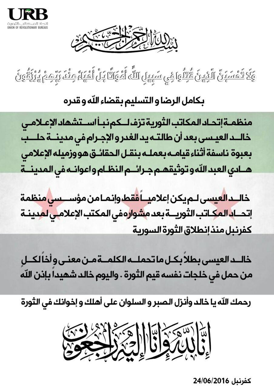 بيان من اتحاد المكاتب الثورية يعزي فيه بالإعلامي خالد العيسى