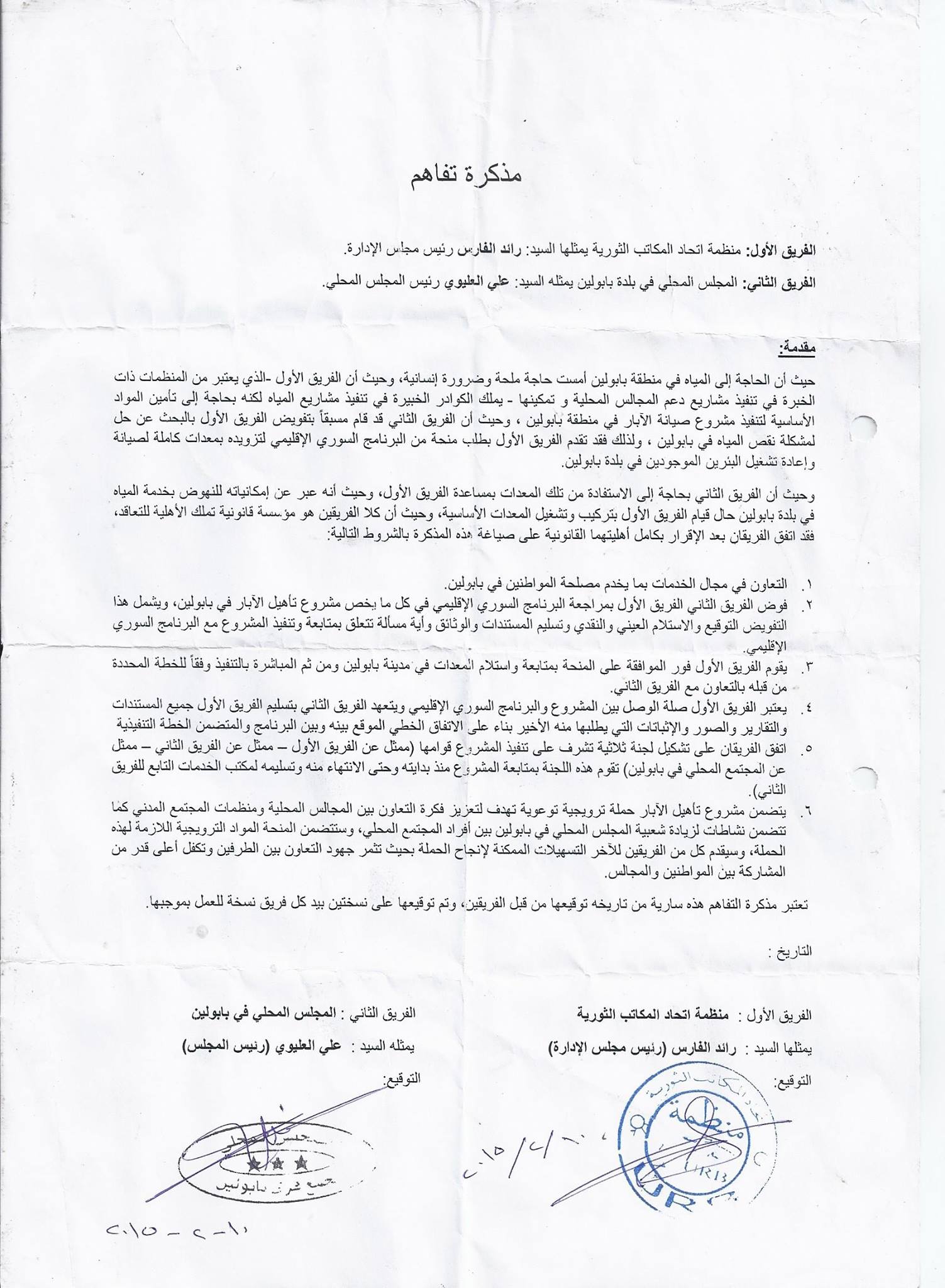 بيان حول مذكرة التفاهم الموقعة بين اتحاد المكاتب الثورية مع المجلس المحلي في بابولين بشأن إعادة تأهيل مورد المياه في القرية