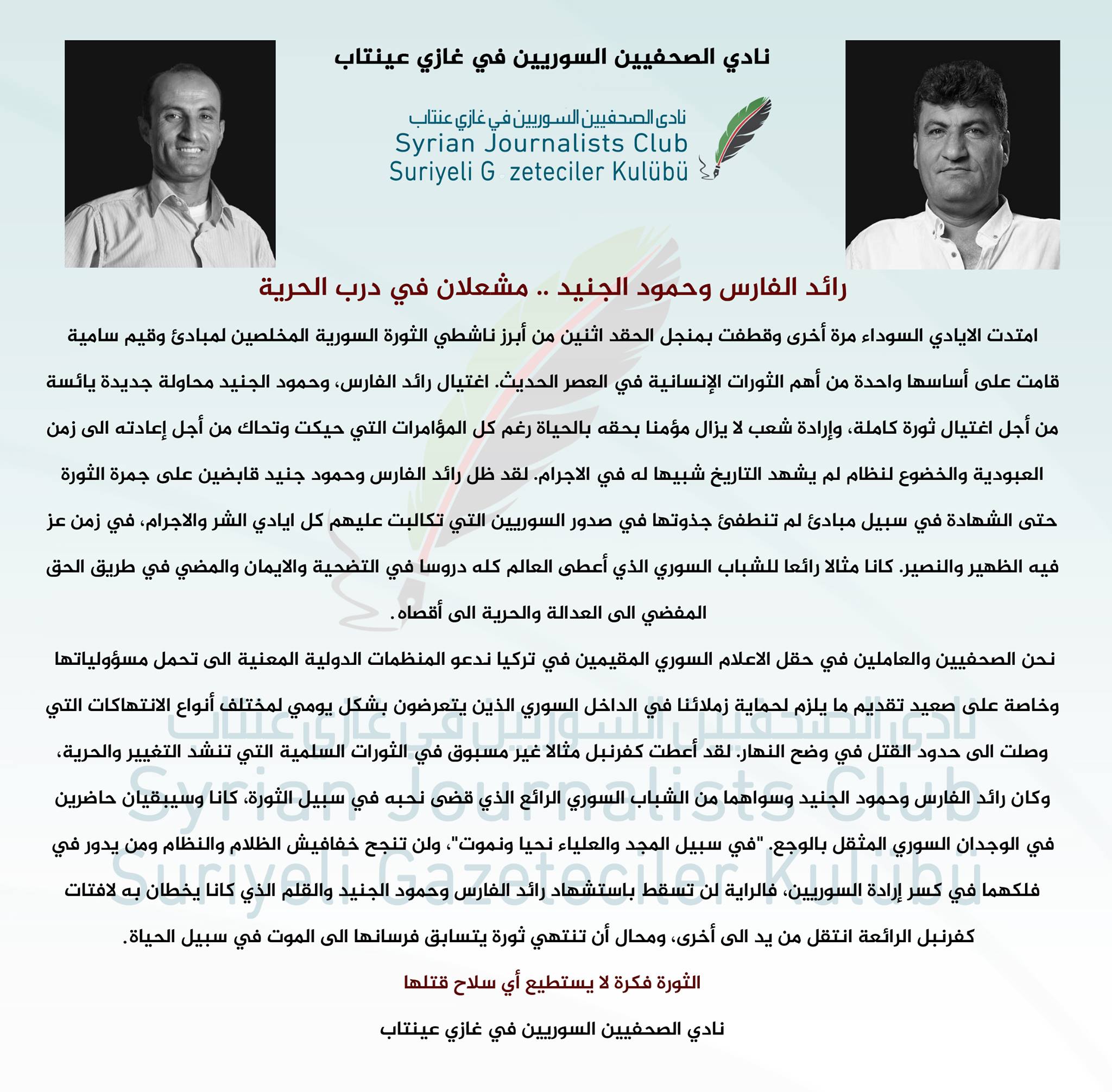 بيان صادر عن نادي الصحفيين السوريين حول اغتيال الناشطين رائد الفارس وحمود جنيد