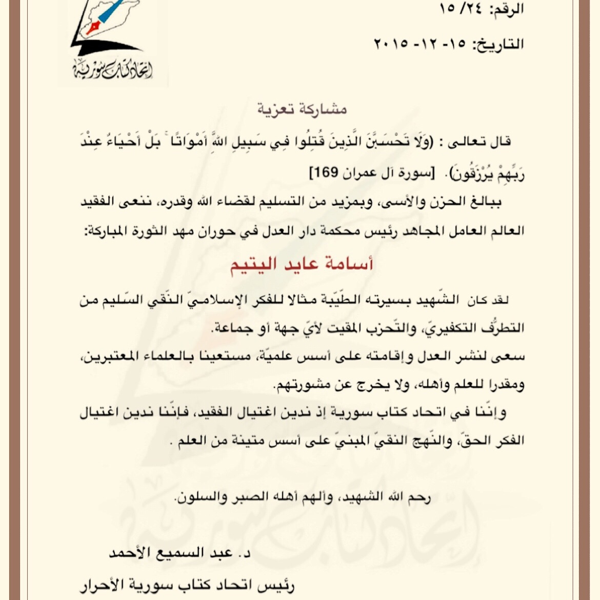 تعزية اتحاد كتاب سورية الأحرار بوفاة الشيخ أسامة اليتيم