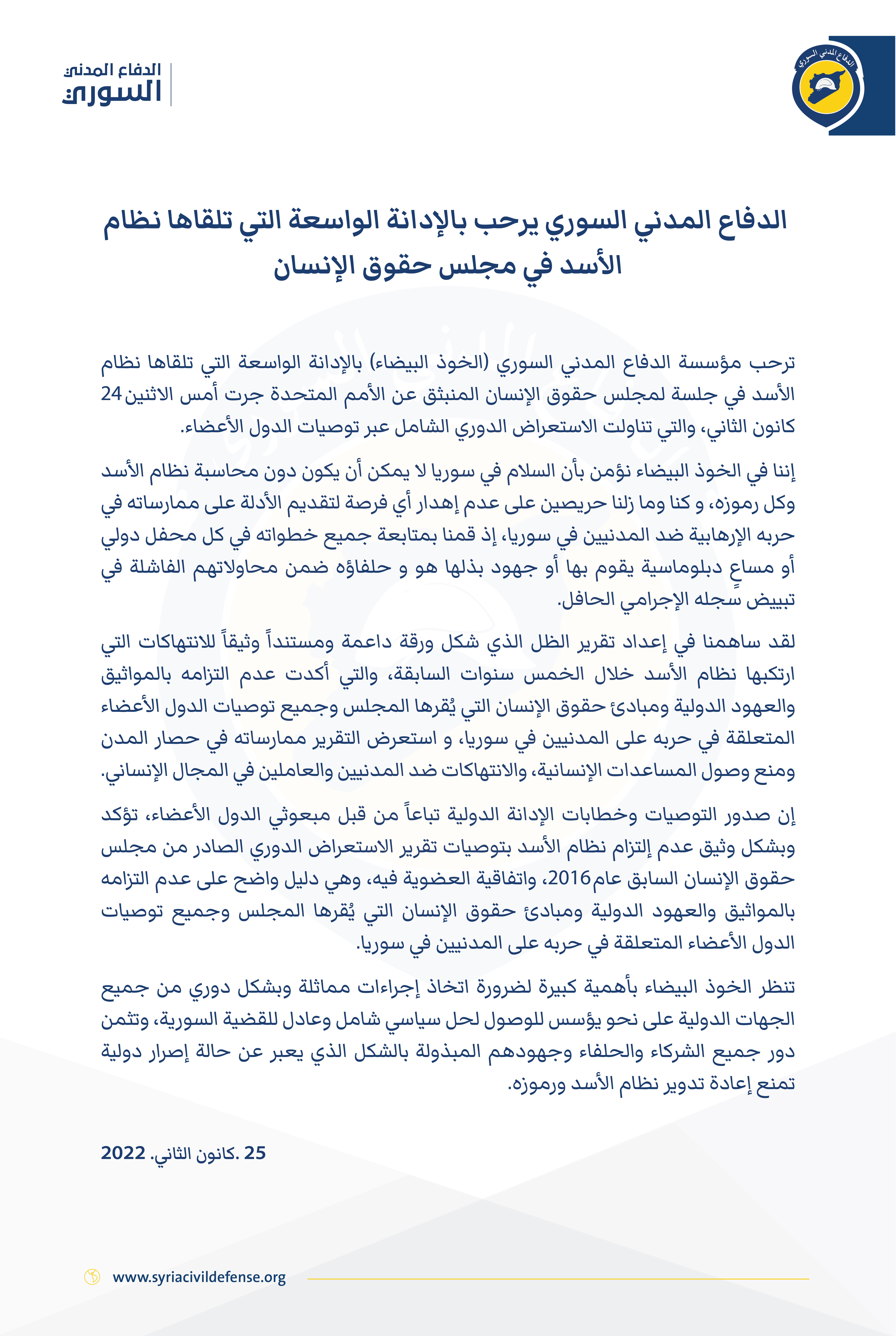 ترحب مؤسسة الدفاع المدني السوري (الخوذ البيضاء) بالإدانة الواسعة التي تلقاها نظام الأسد في جلسة لمجلس حقوق الإنسان المنبثق عن الأمم المتحدة جرت أمس الاثنين 24 كانون الثاني، والتي تناولت الاستعراض الدوري الشامل عبر توصيات الدول الأعضاء.