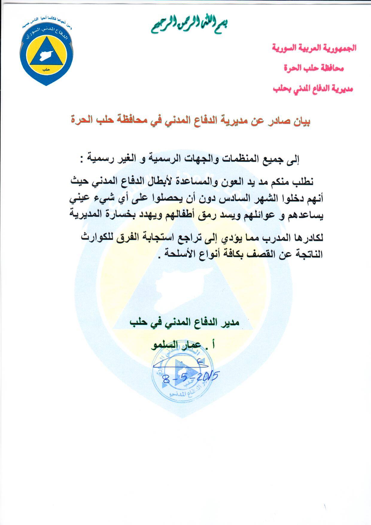 بيان صادر عن مديرية الدفاع المدني في محافظة حلب الحرة