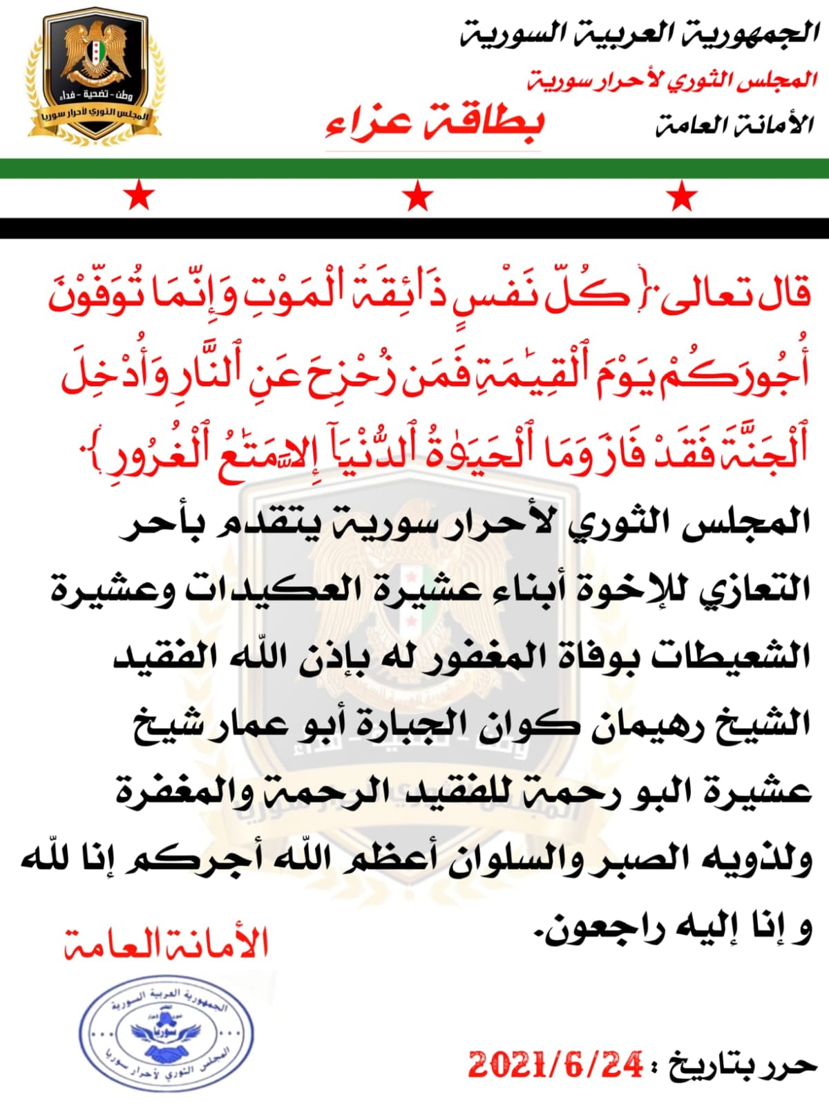 بيان من المجلس الثوري لأحرار سورية يعزي فيه بوفاة رهيمان كوان الجبارة شيخ عشيرة البورحمة