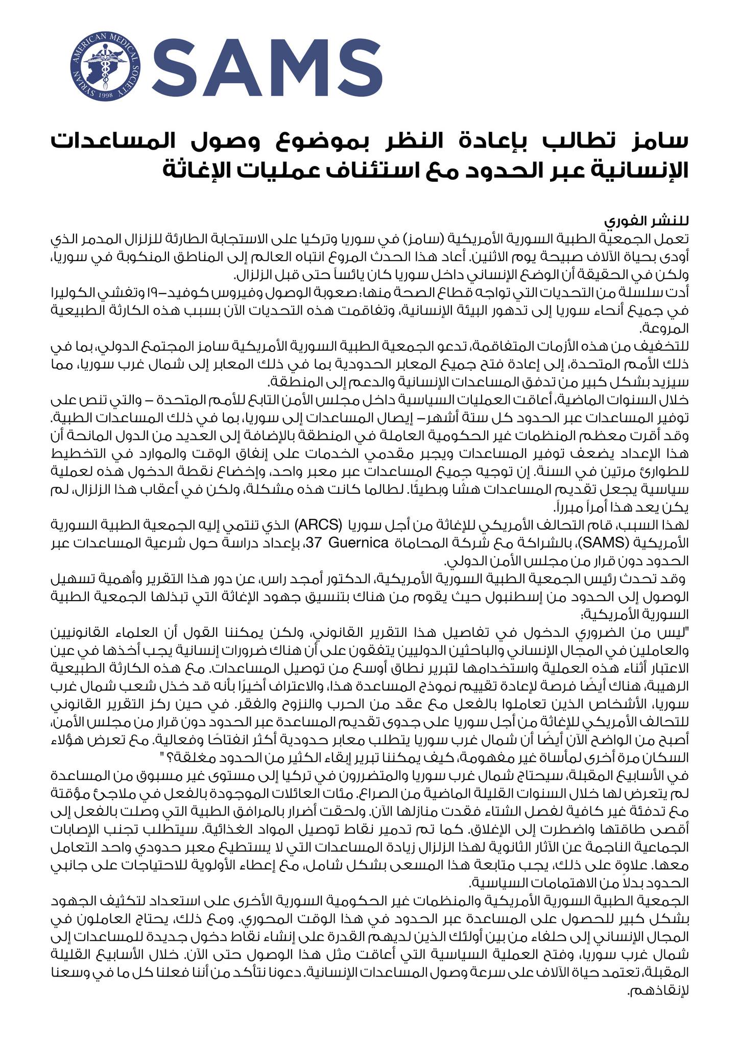 لهذا السبب، قام التحالف الأمريكي للإغاثة من أجل سوريا (ARCS) [American Relief Coalition for Syria](https://www.facebook.com/ARCSyria/?__tn__=kK*F) الذي تنتمي إليه الجمعية الطبية السورية الأمريكية (SAMS)، بالشراكة مع شركة المحاماة Guernica 37، بإعداد دراسة حول شرعية المساعدات عبر الحدود دون قرار من مجلس الأمن الدولي.
