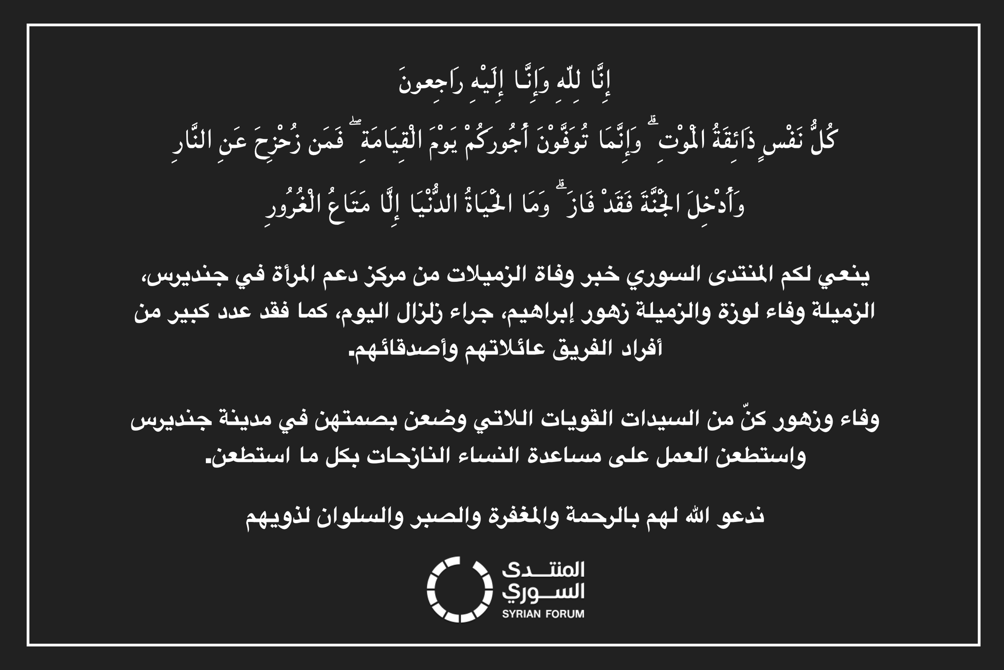 بيان من المنتدى السوري ينعي فيه اثنتين من العاملات في مركز دعم المرأة في جنديرس جراء الزلزال