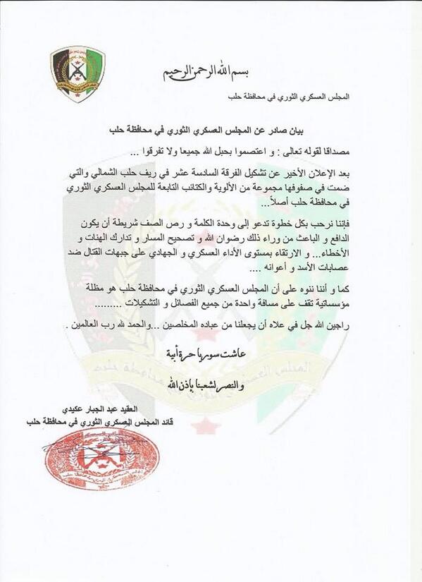 بيان ترحيب من المجلس العسكري في حلب بتشكيل الفرقة 16 في ريف حلب الشمالي