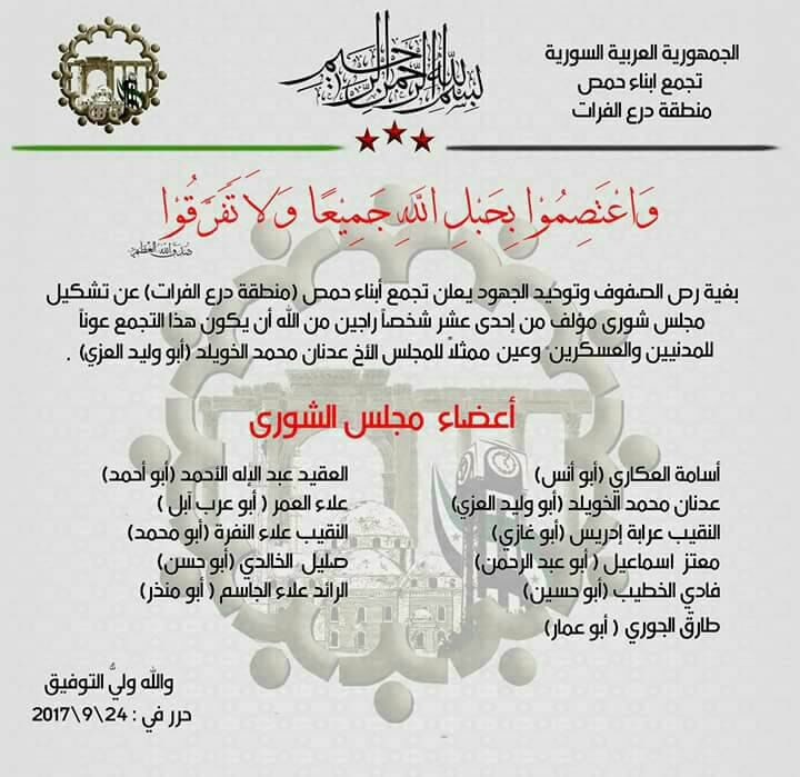 بيان تجمع ثوار حمص في منطقة درع الفرات لتشكيل مجلس شورى خاص به